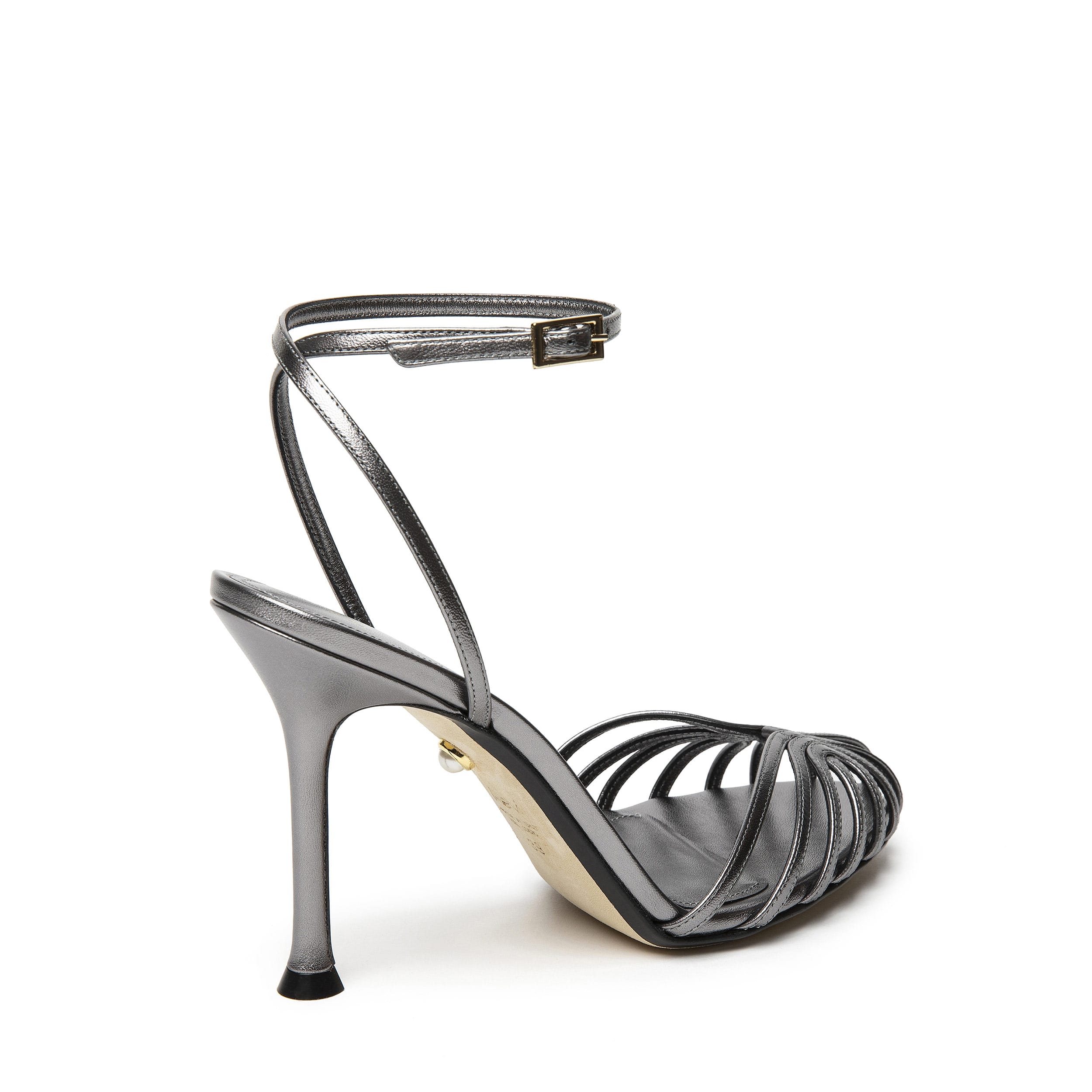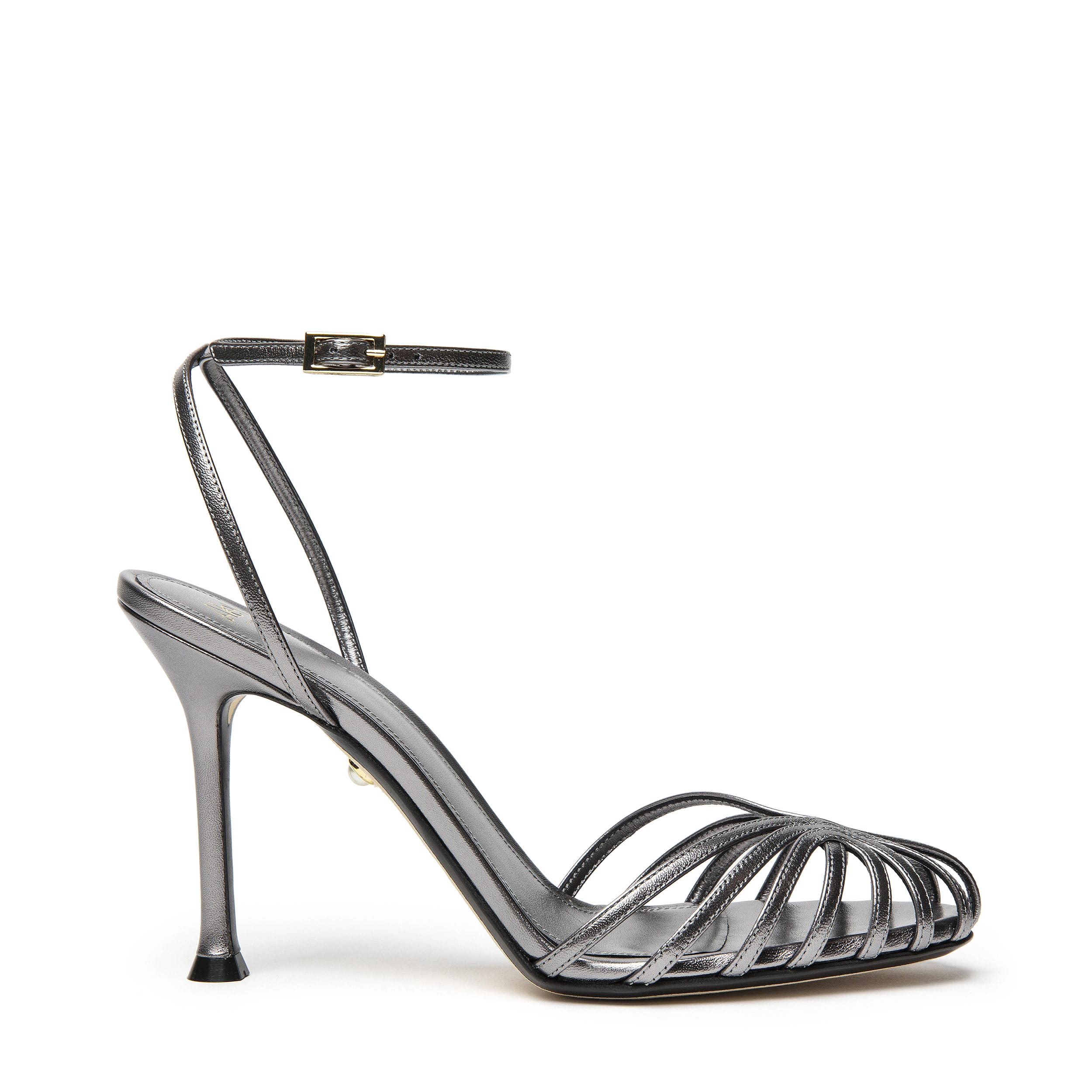 Shiny leather cage sandals with covered heel in tone. Thin strips at the toe and crossed ankle strap with small side buckle.