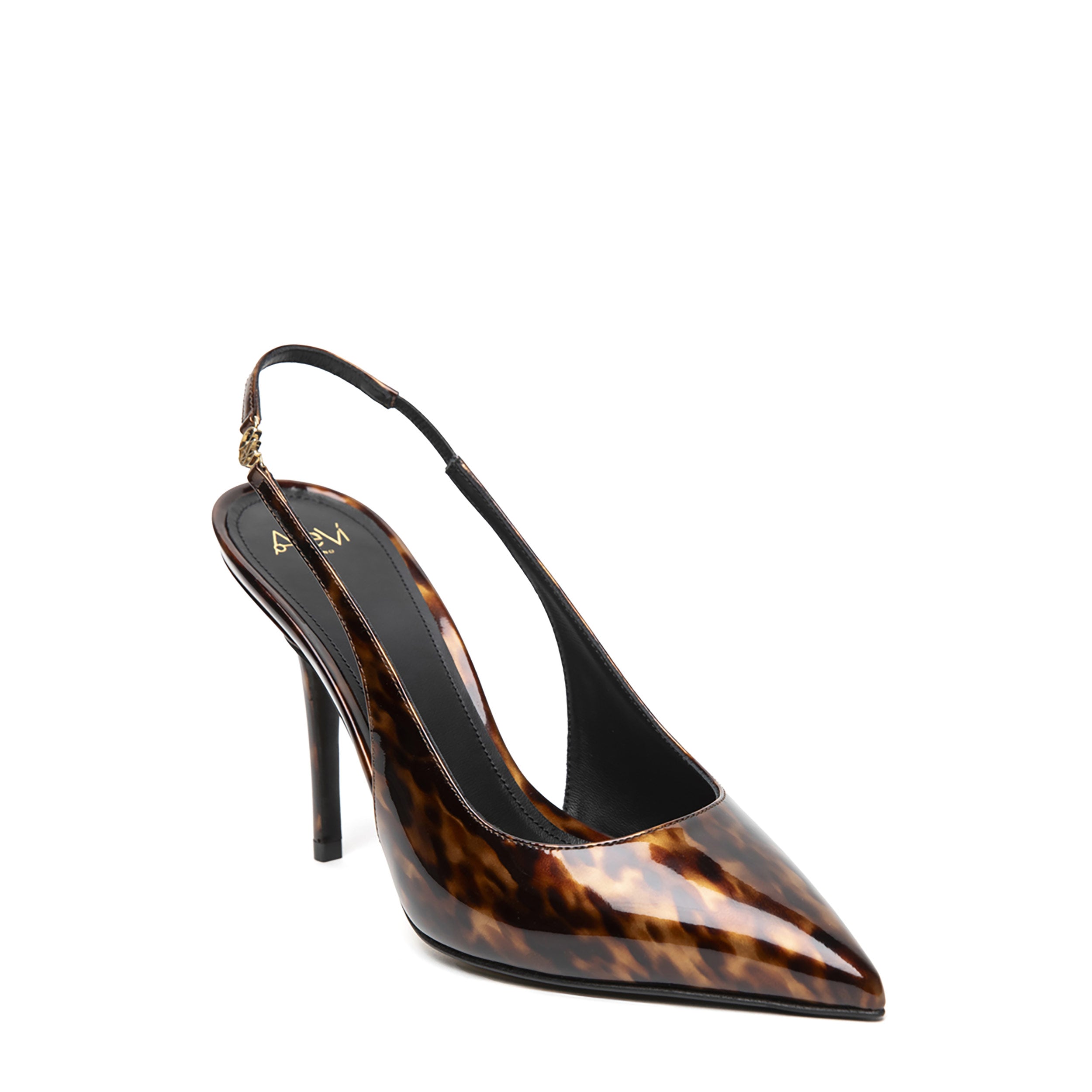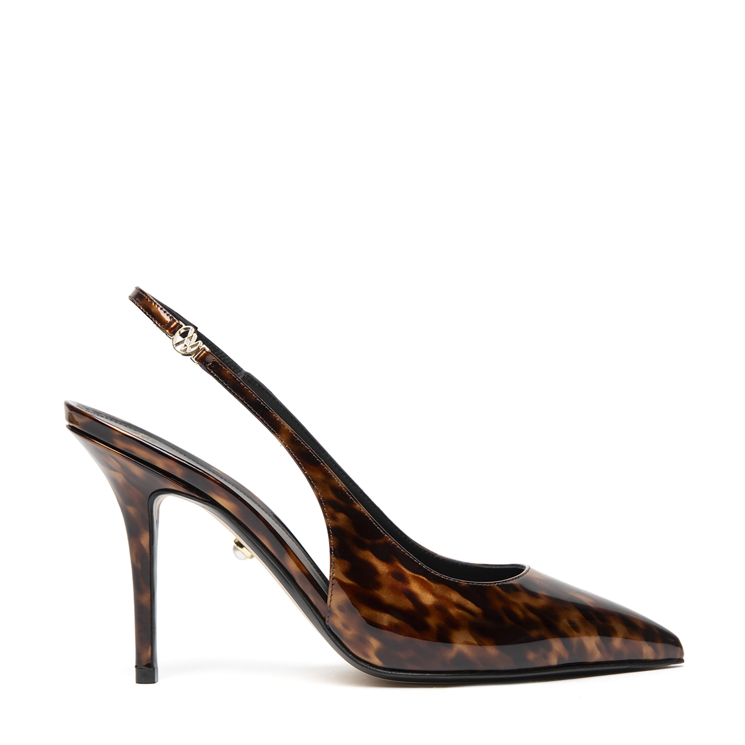 Slingback pointed-toe pump in turtle-printed leather with stiletto heel