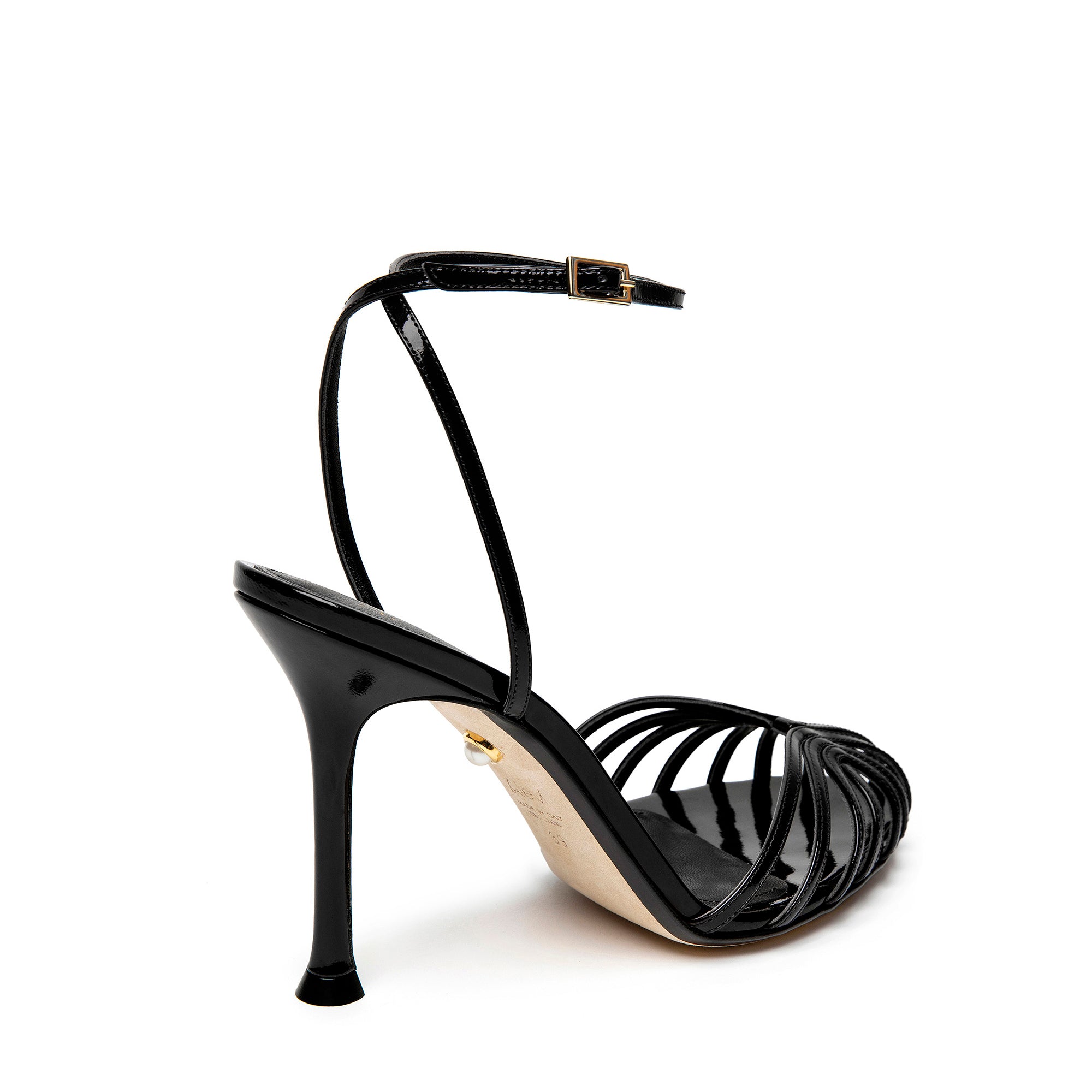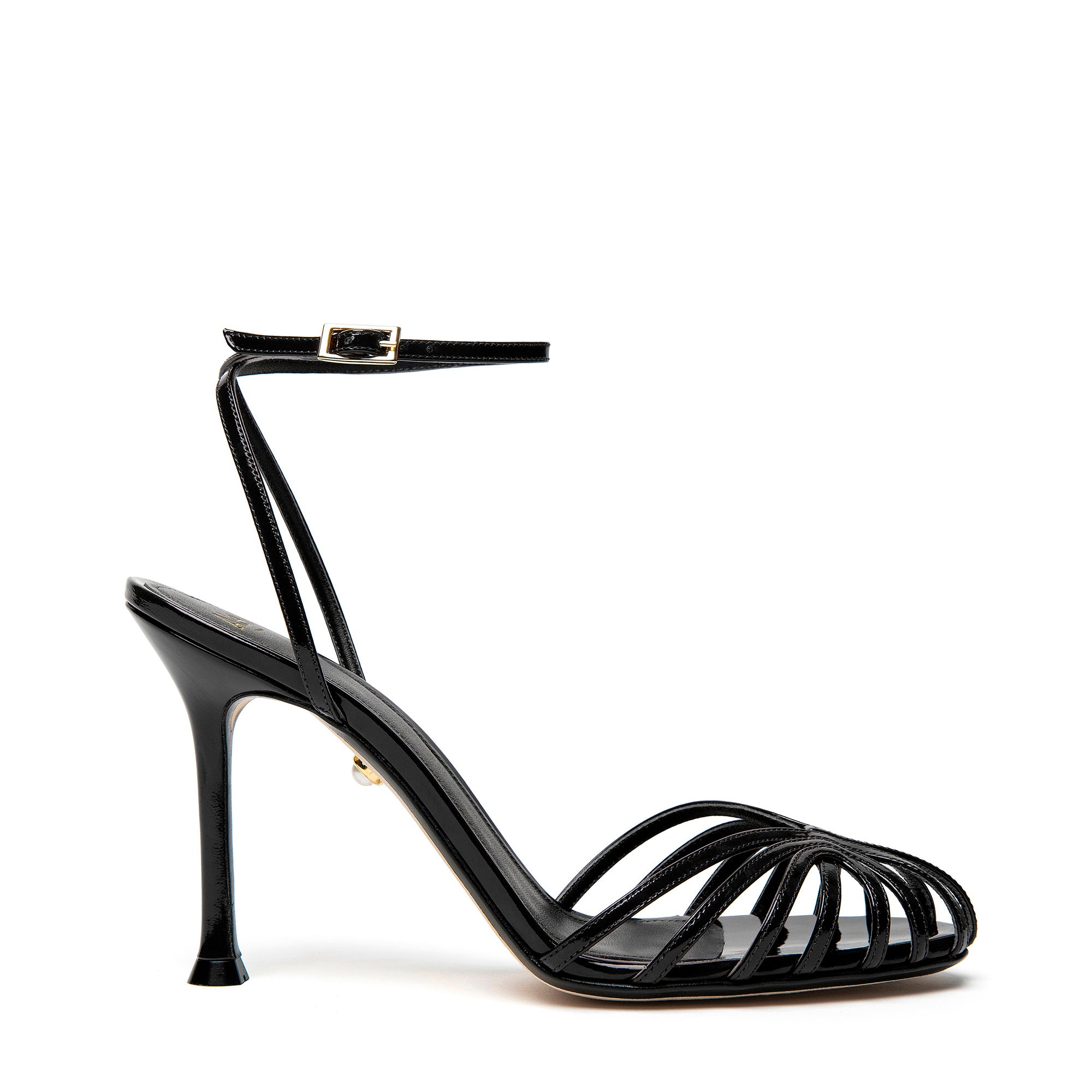 Cage sandal in patent leather with a tone-on-tone covered heel. Features thin straps at the toe and a crisscross ankle strap with a small side buckle.