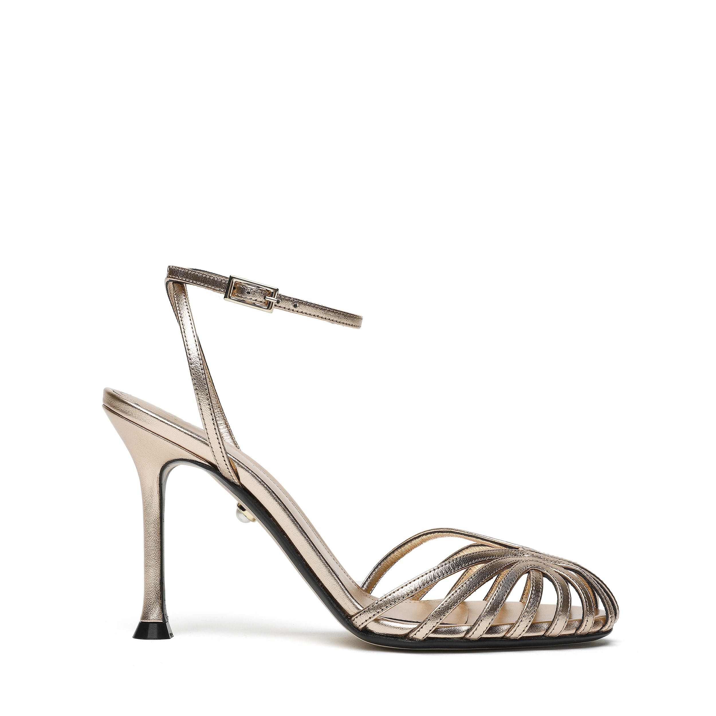 Laminated leather cage sandal with tone-on-tone covered heel. Featuring a crisscross ankle strap with small side buckle.