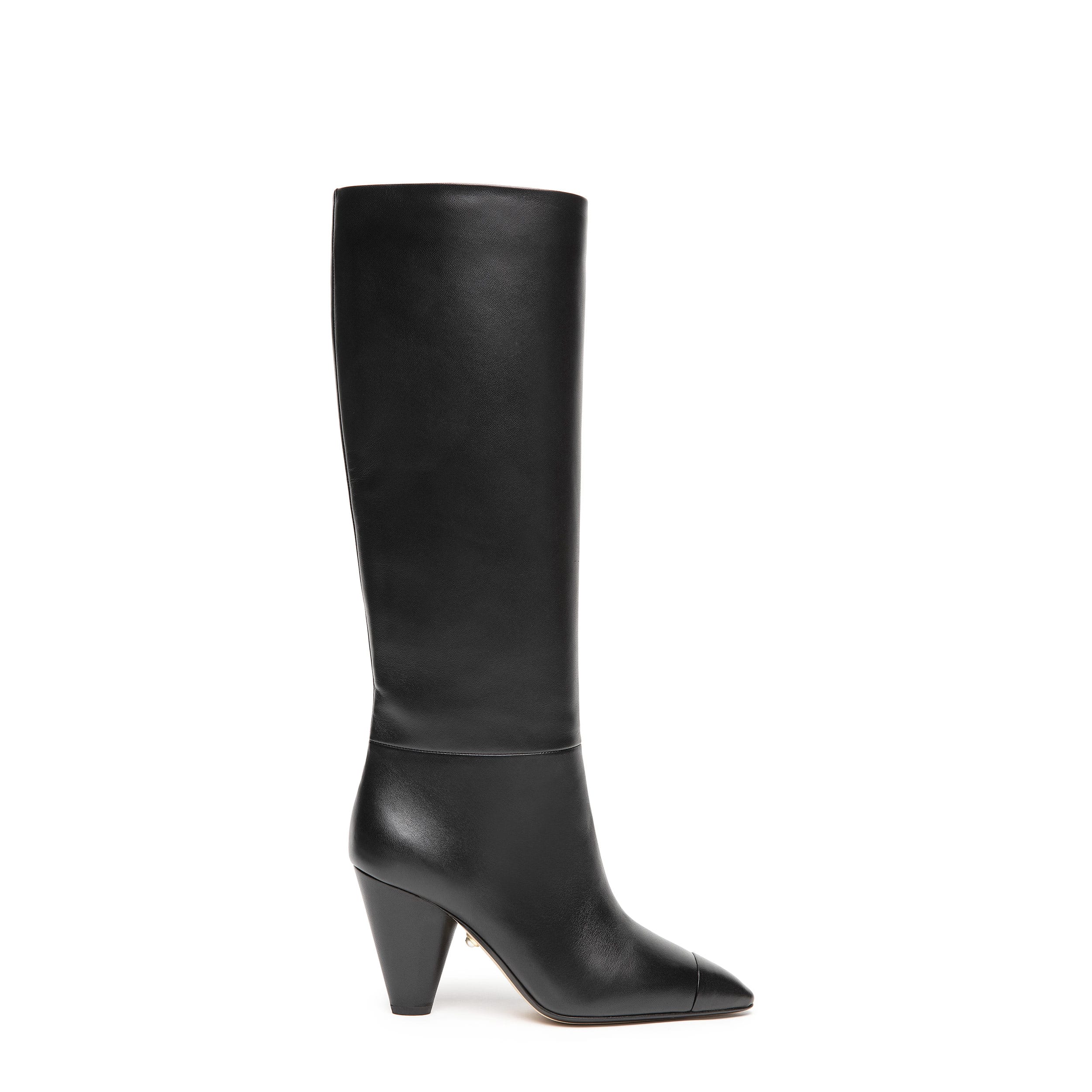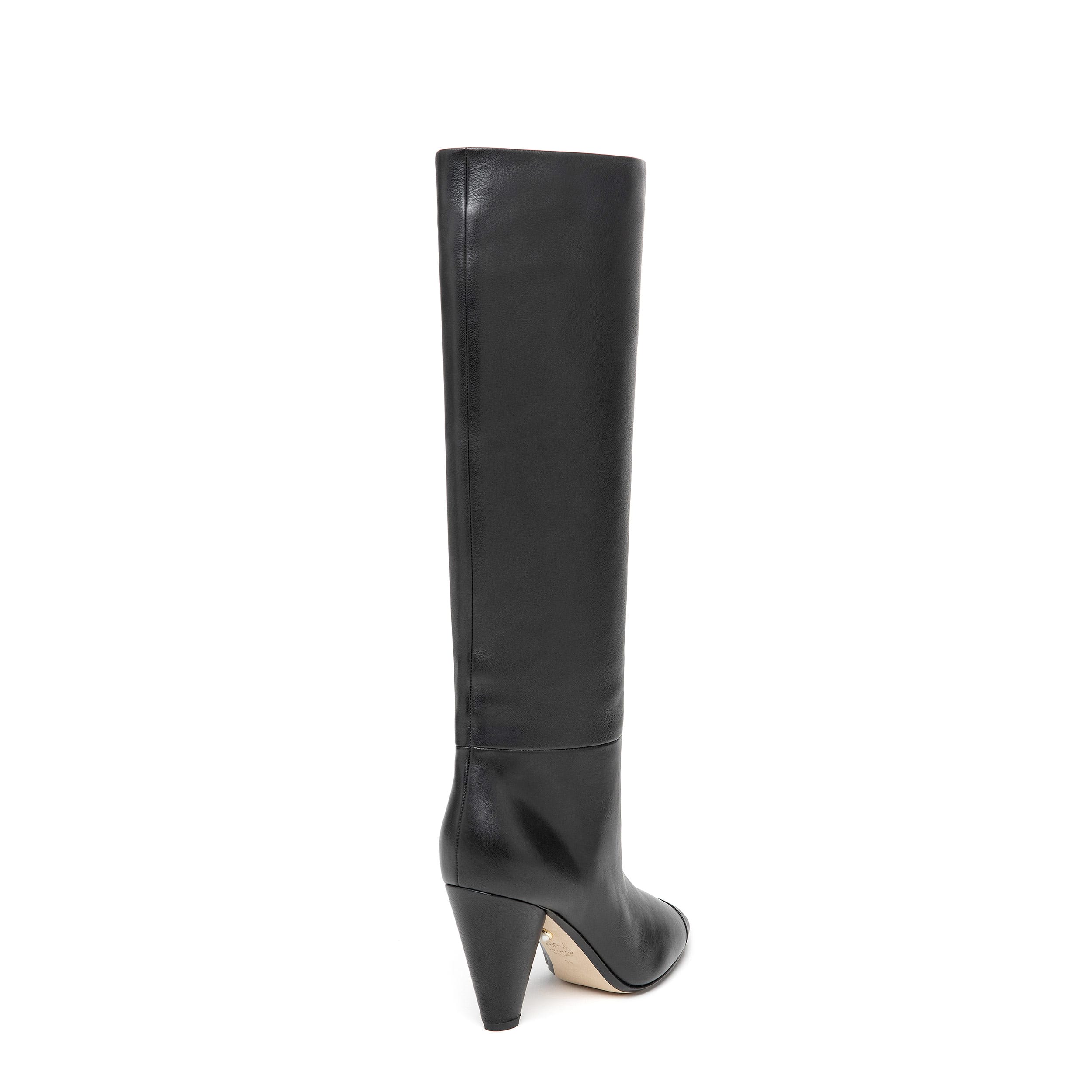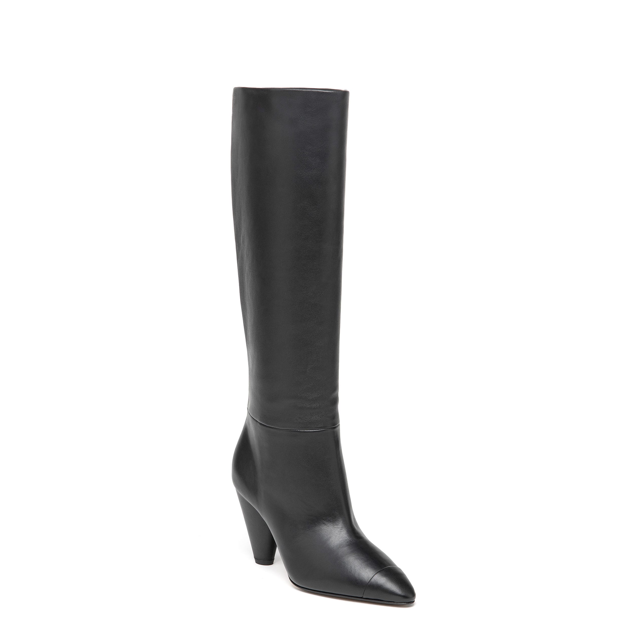Knee boot in calf leather with a pointed toe and a cone heel.