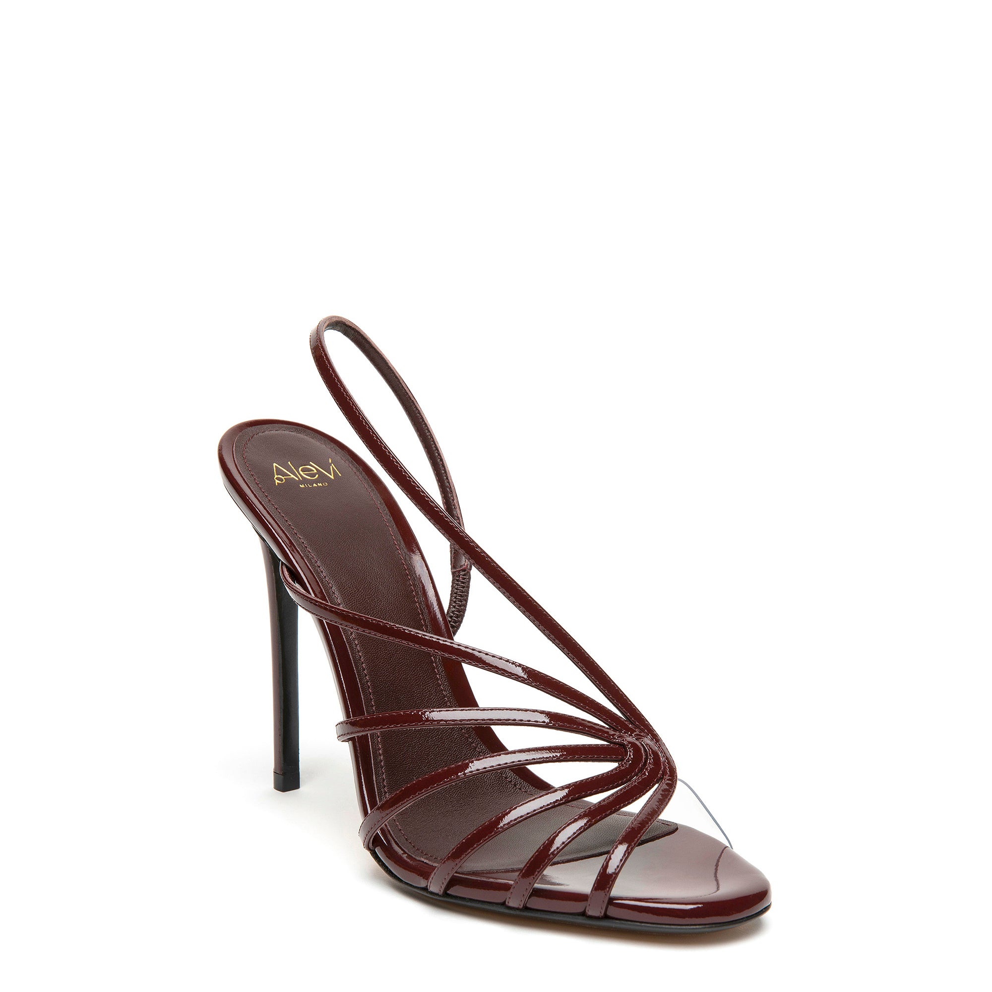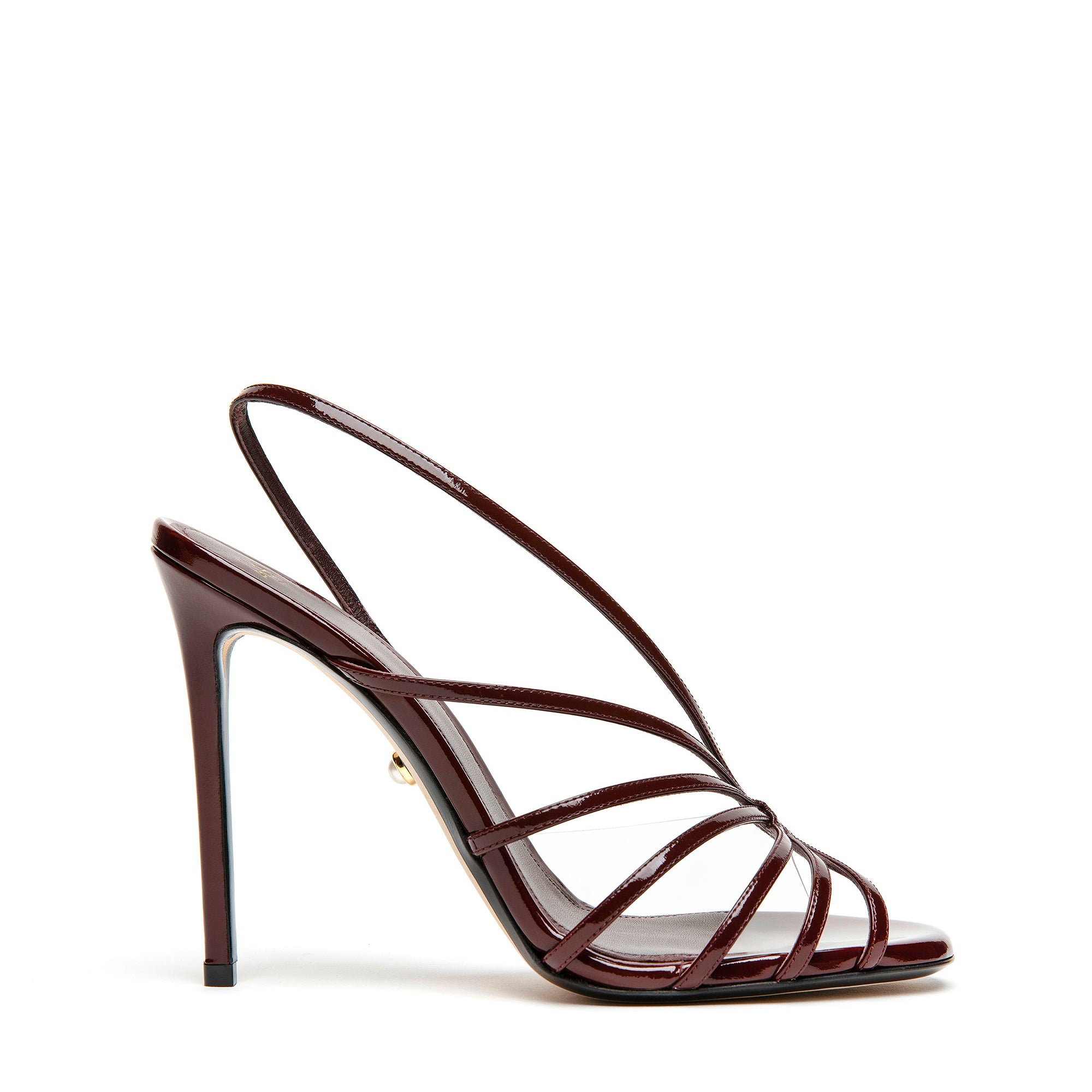 Sandal with asymmetric straps in patent leather, set on a stiletto heel