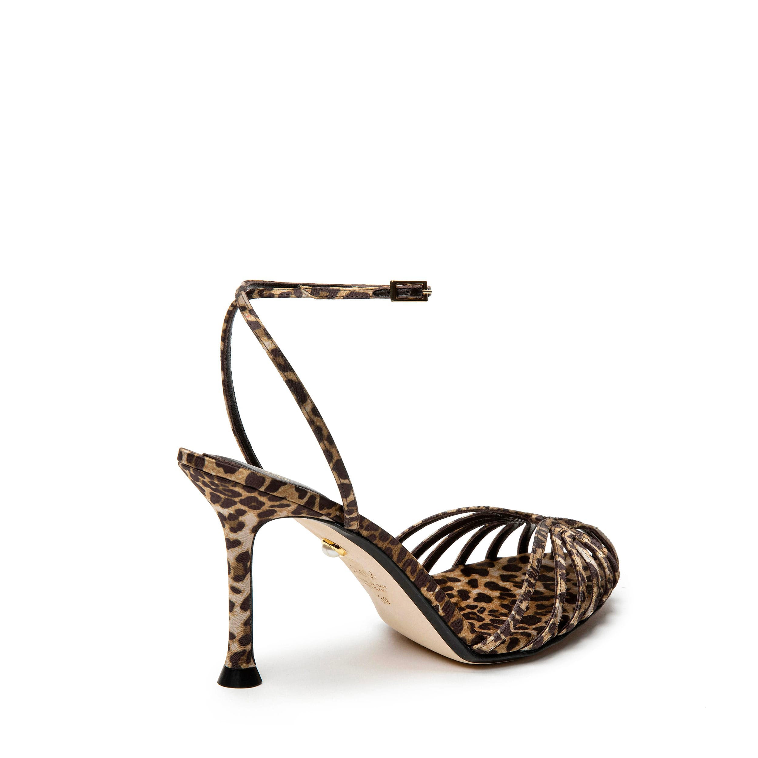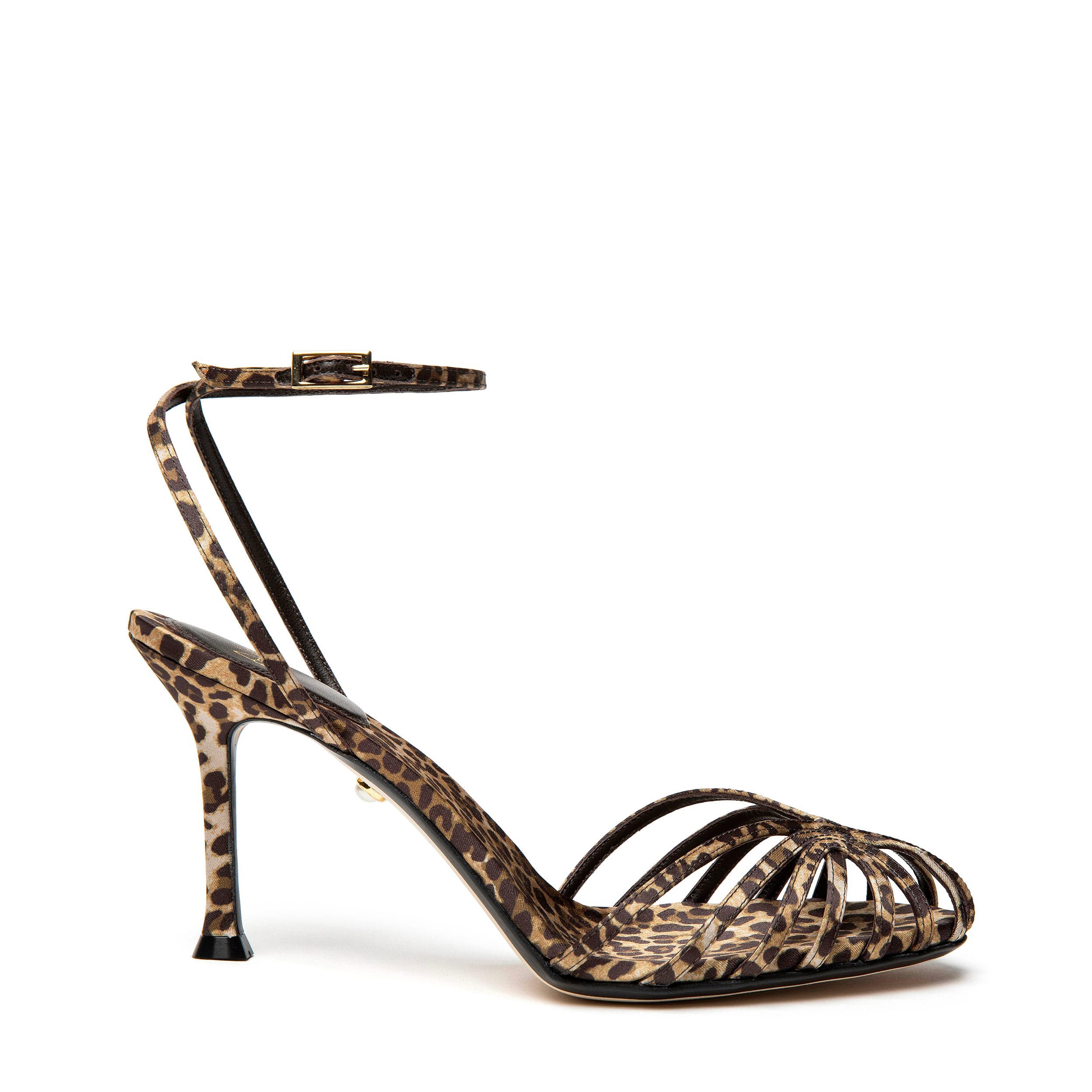 Sandalo iconico gabbia in tessuto stampa animalier con tacco ricoperto in tono. Caratterizzato da cinturino incrociato alla caviglia con piccola fibbia laterale.