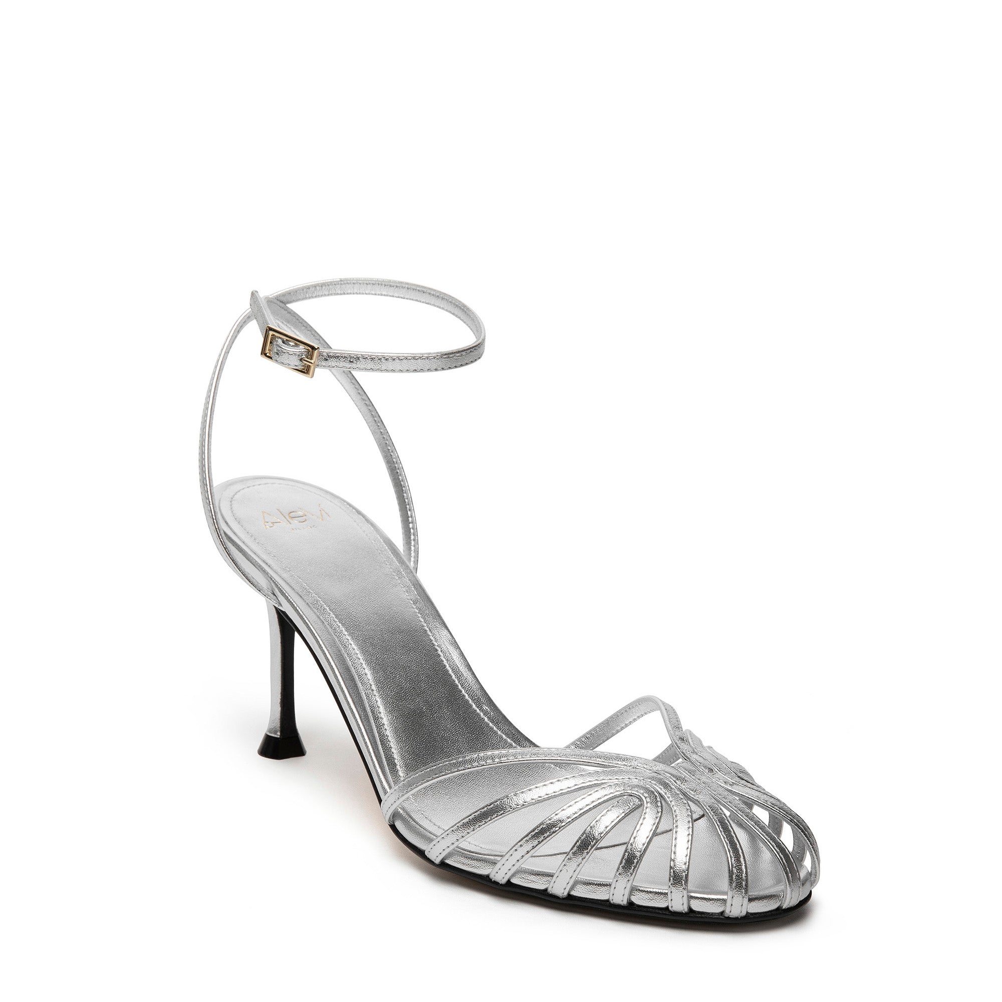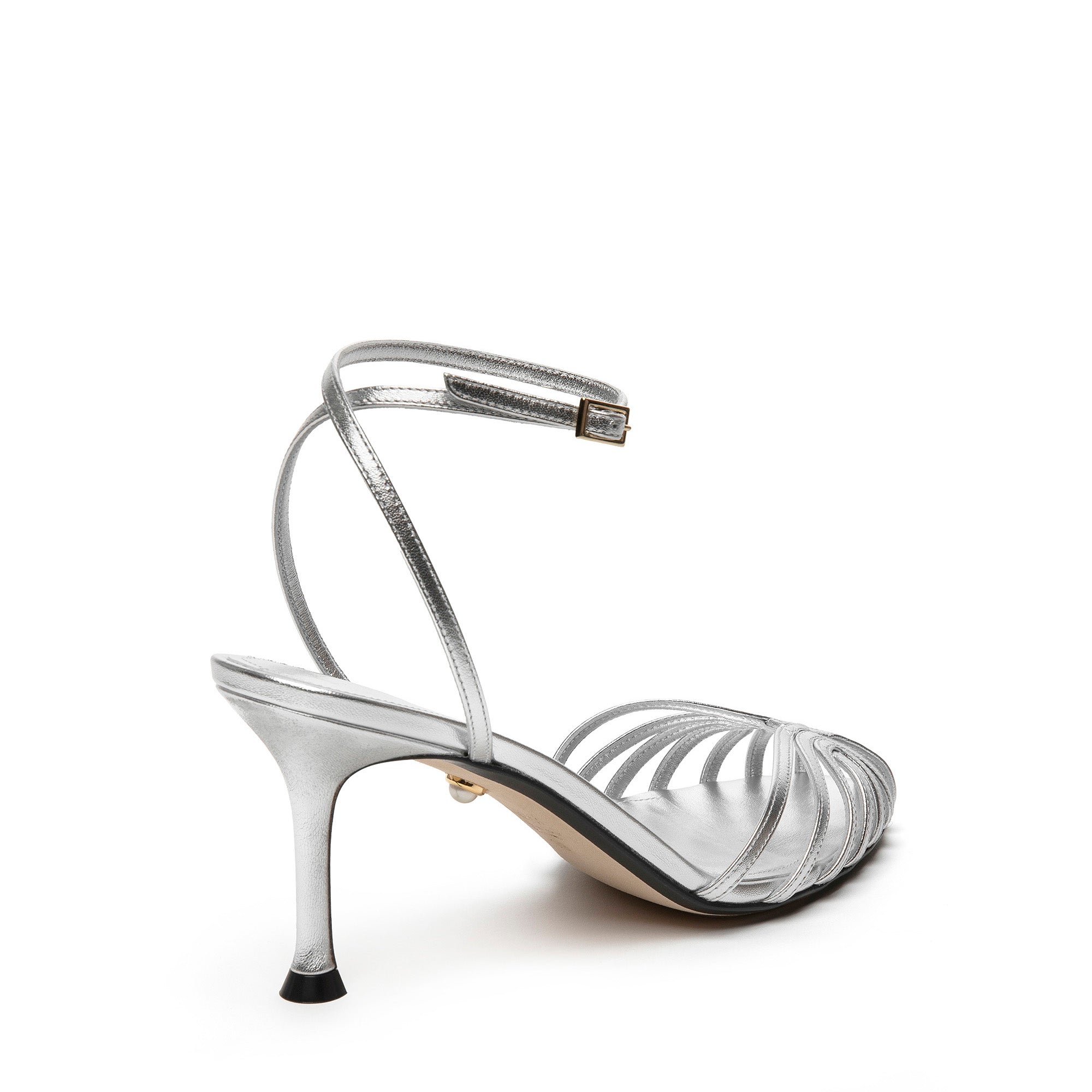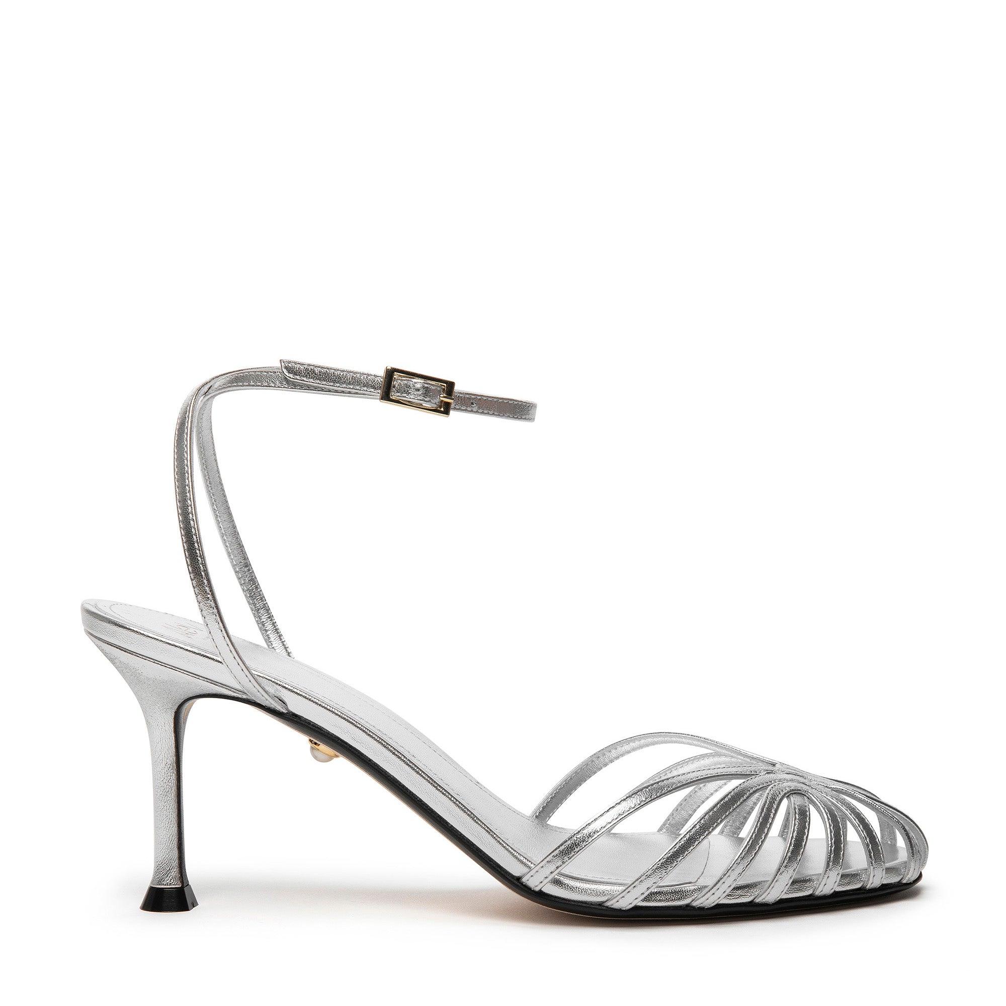 Sandalo gabbia in pelle laminata con tacco ricoperto in tono. Caratterizzato da listini sottili in punta e cinturino incrociato alla caviglia con piccola fibbia laterale.