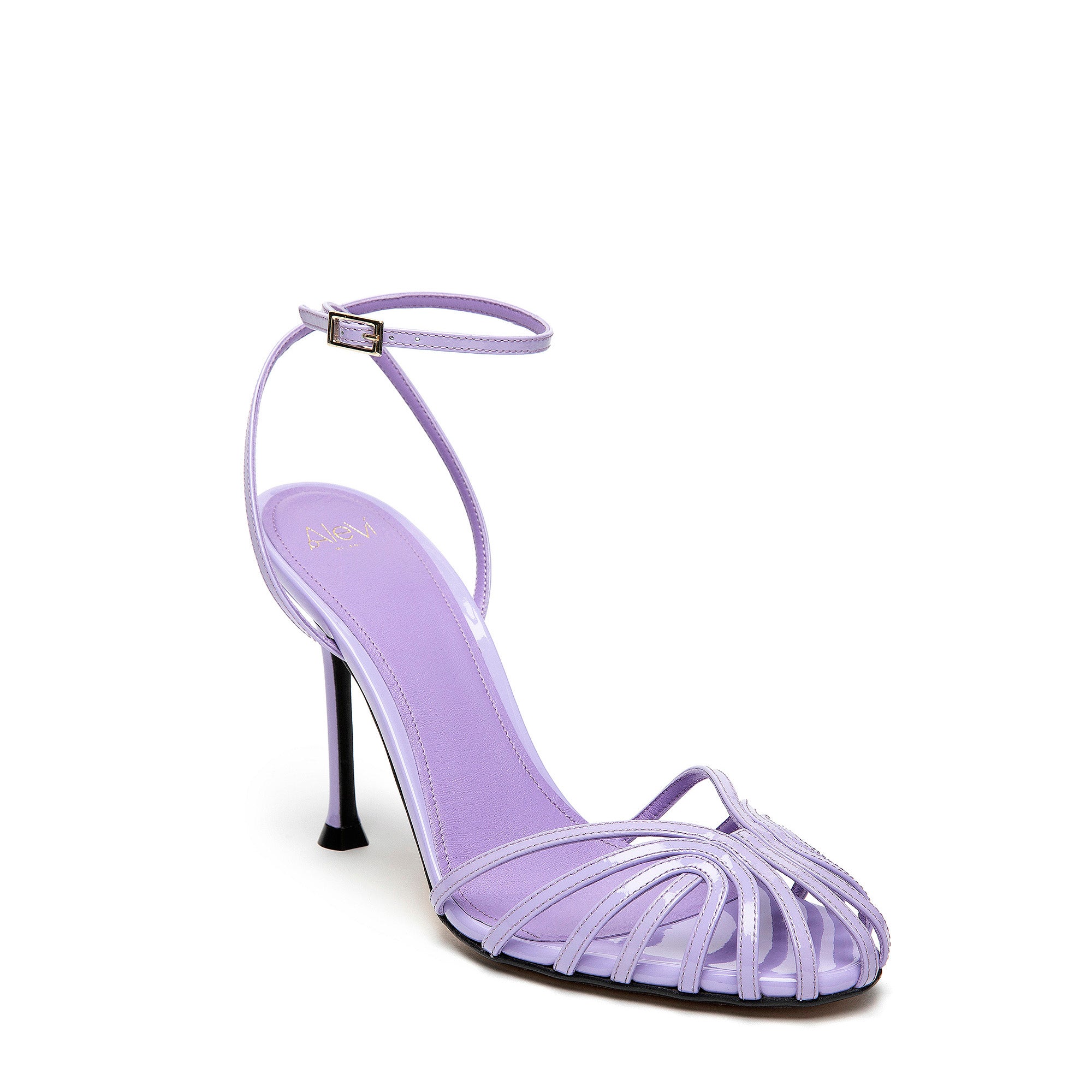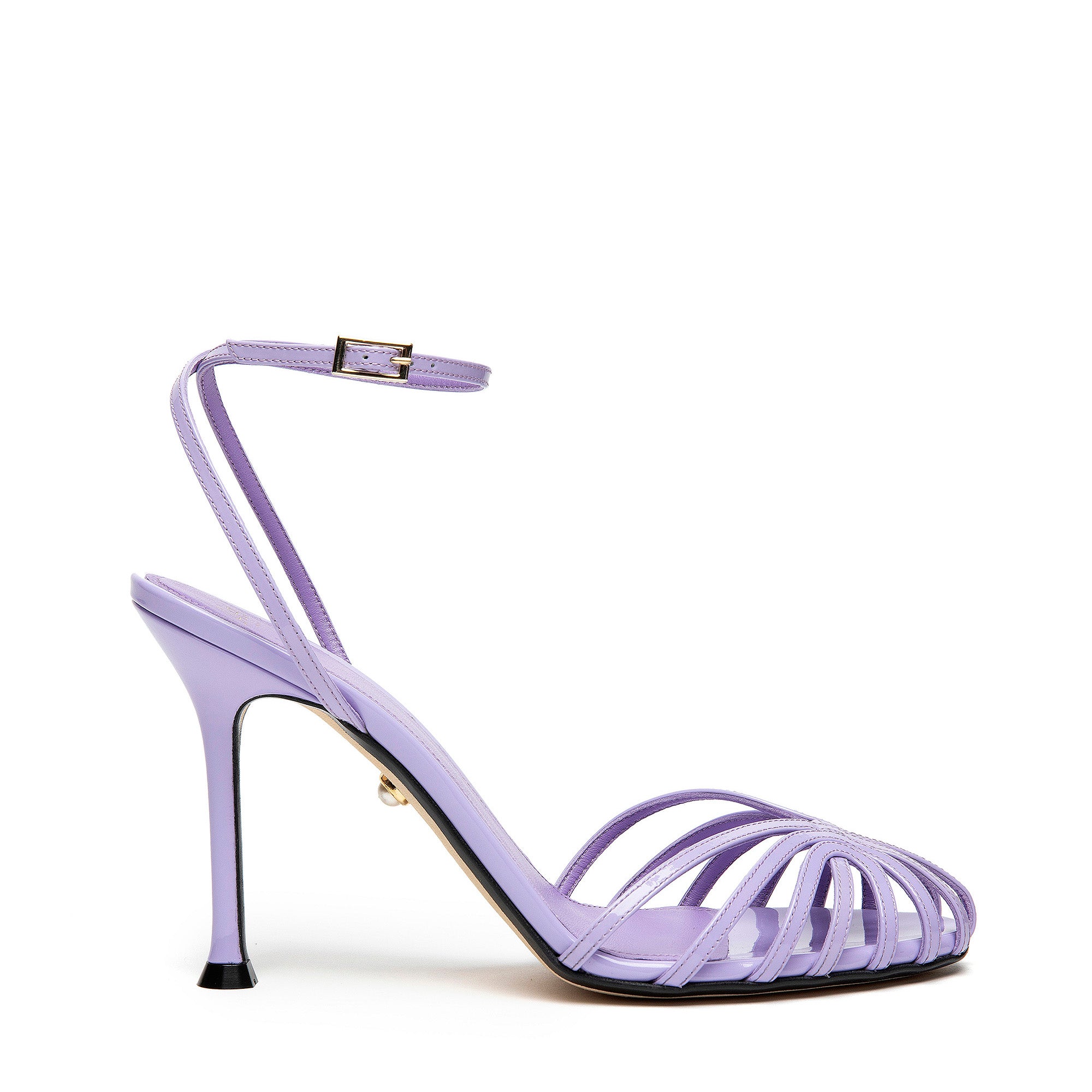 Sandalo gabbia in vernice con tacco laccato in tono. Caratterizzato da listini sottili in punta e cinturino incrociato alla caviglia con piccola fibbia laterale.