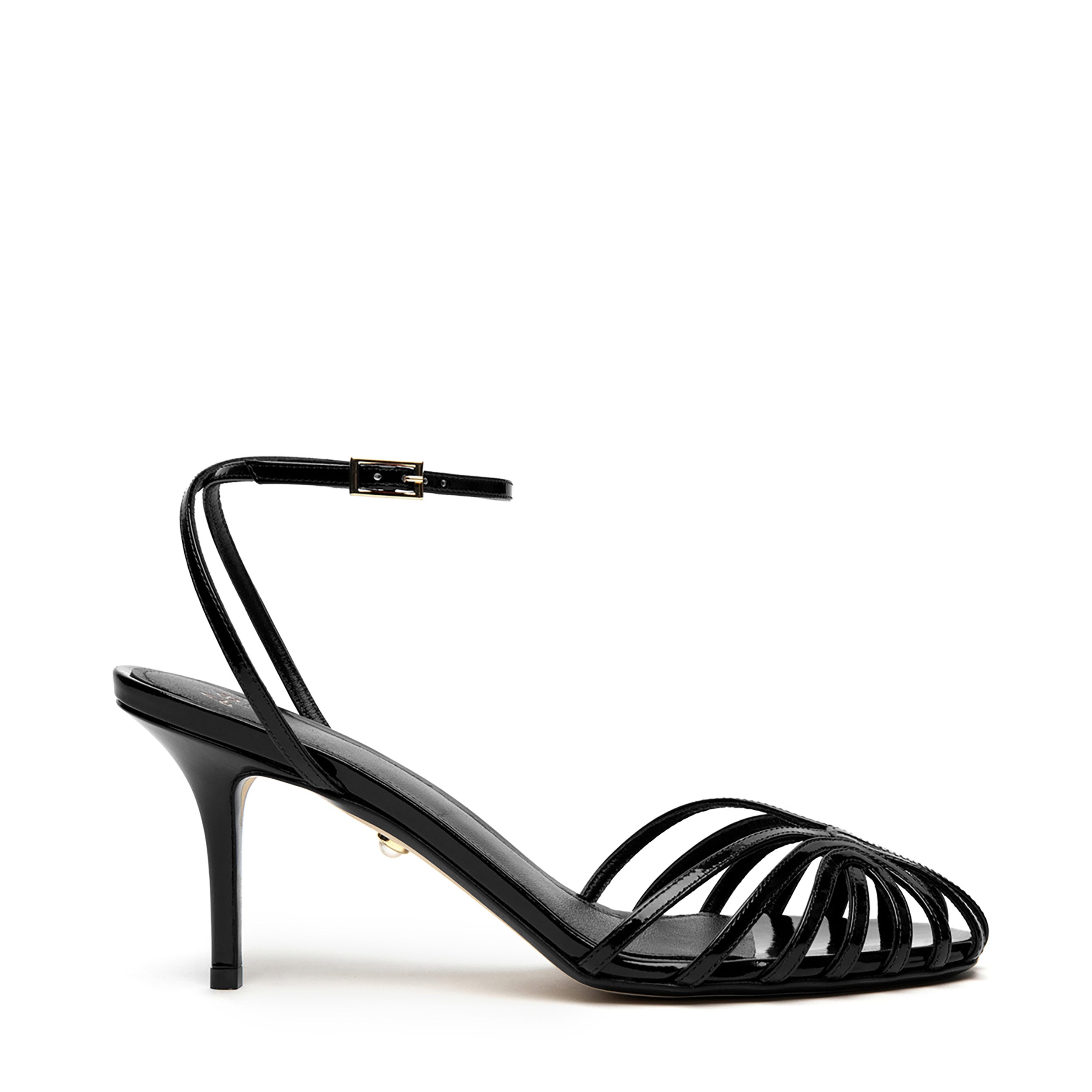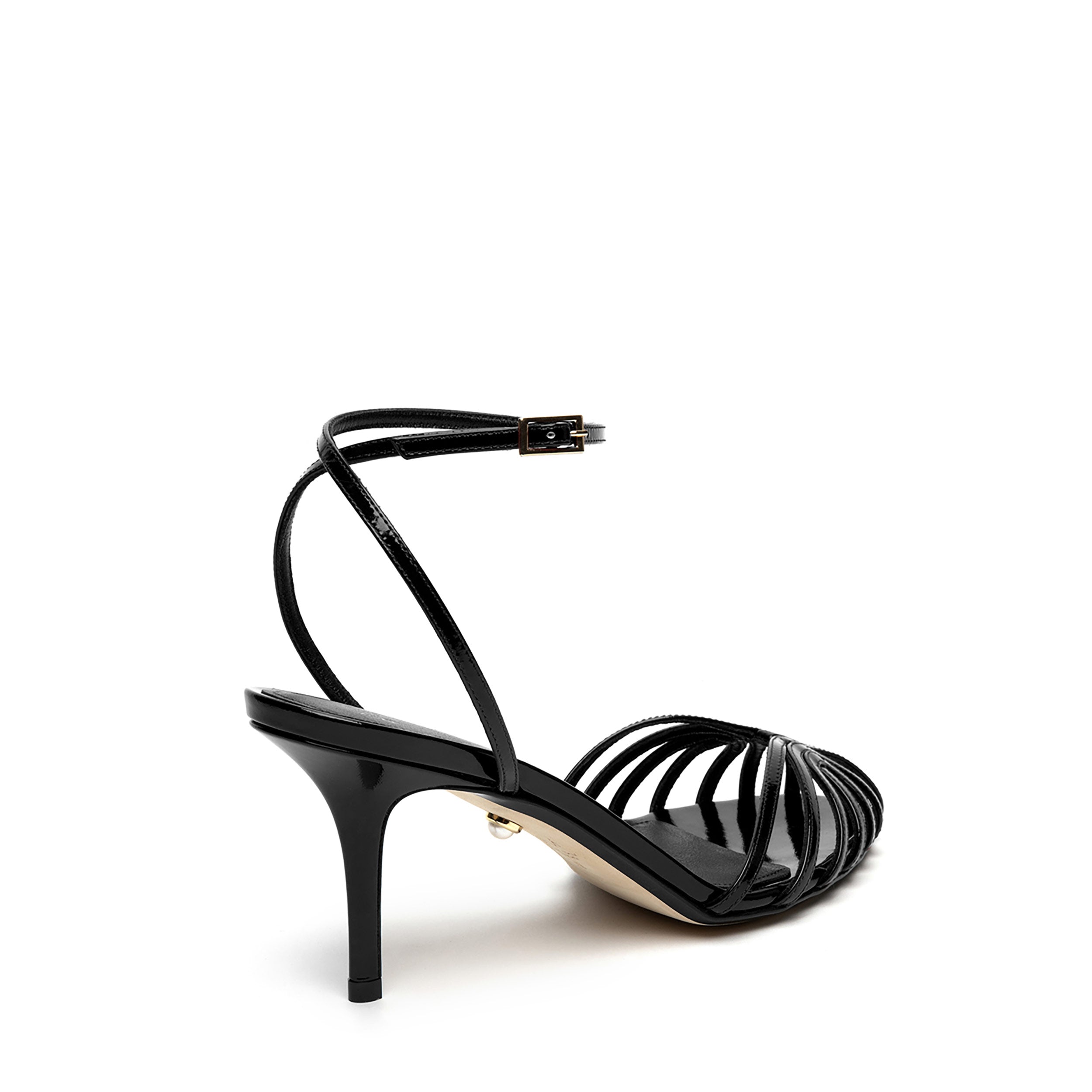 Sandalo gabbia in vernice con tacco ricoperto in tono. Caratterizzato da listini sottili in punta e cinturino incrociato alla caviglia con piccola fibbia laterale