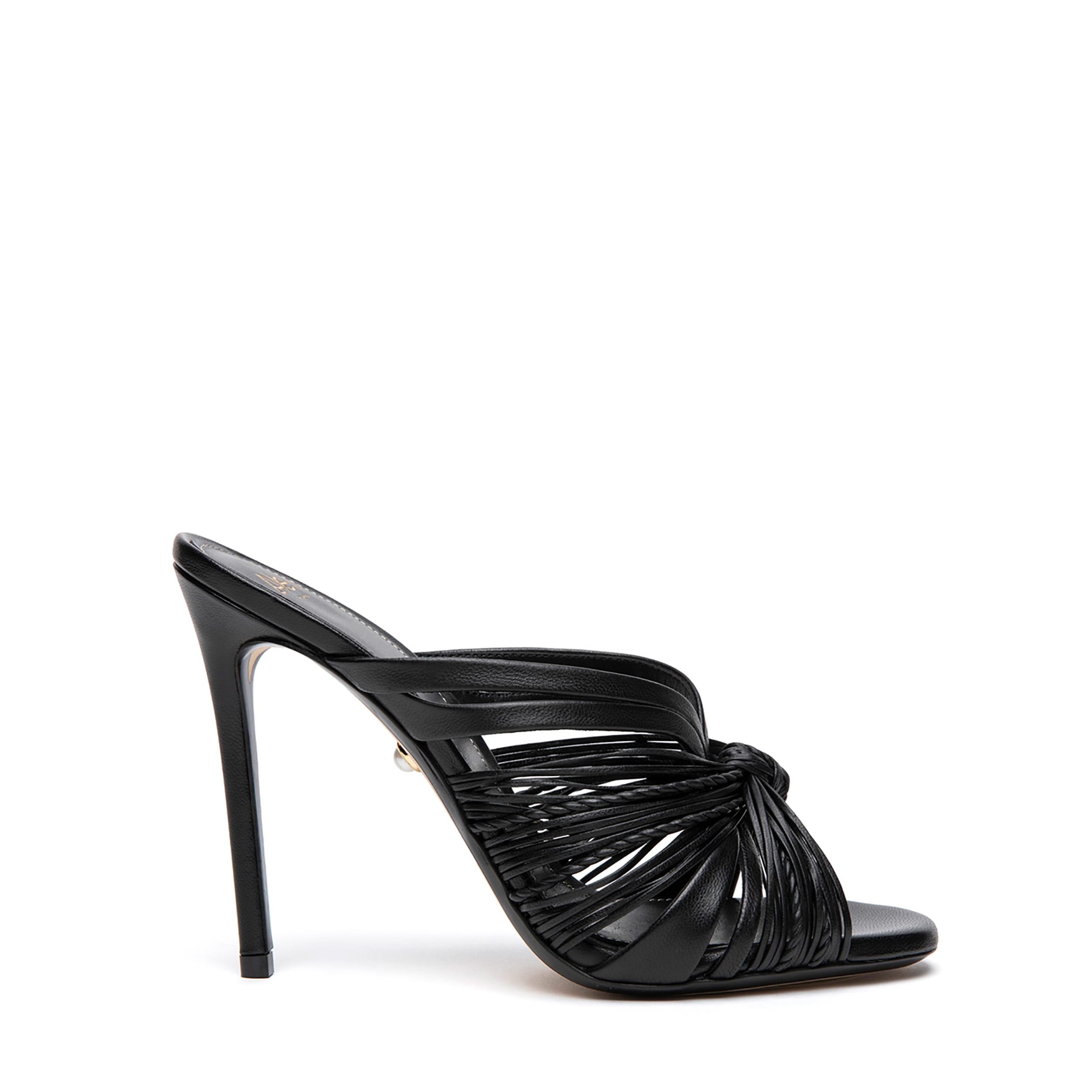 Mule in pelle laminata con sottili listini intrecciati che formano un elegante nodo centrale, completata da un tacco stiletto.