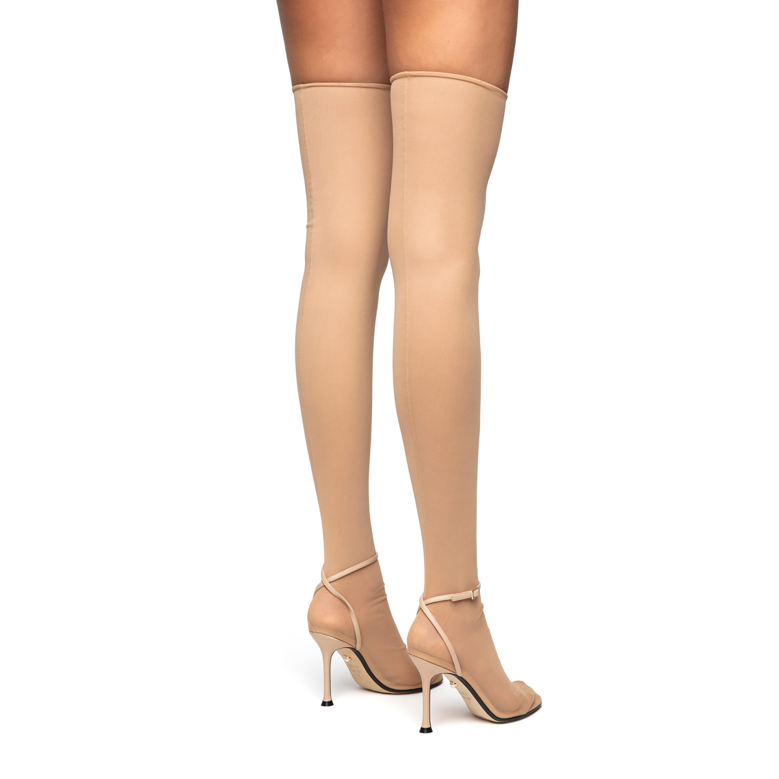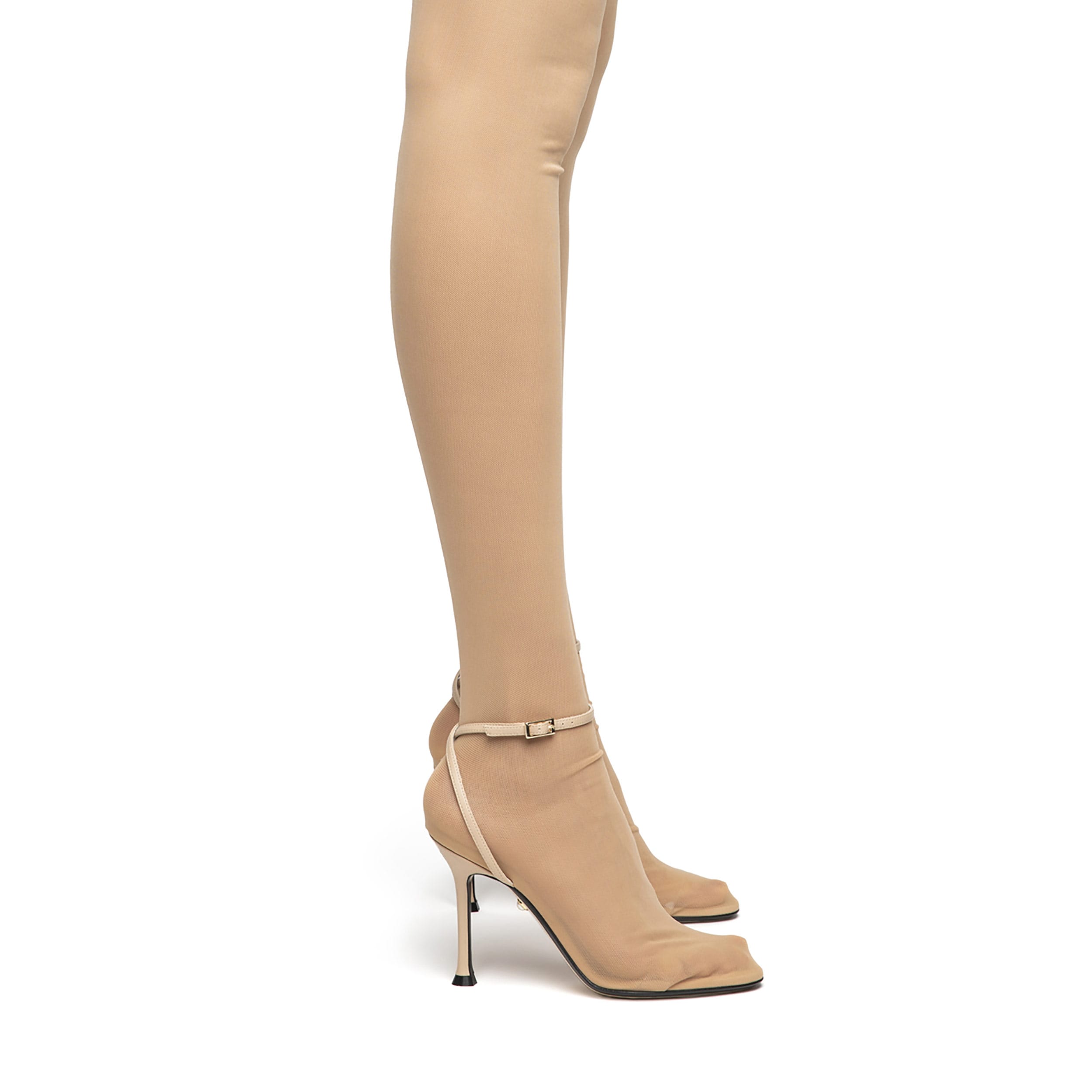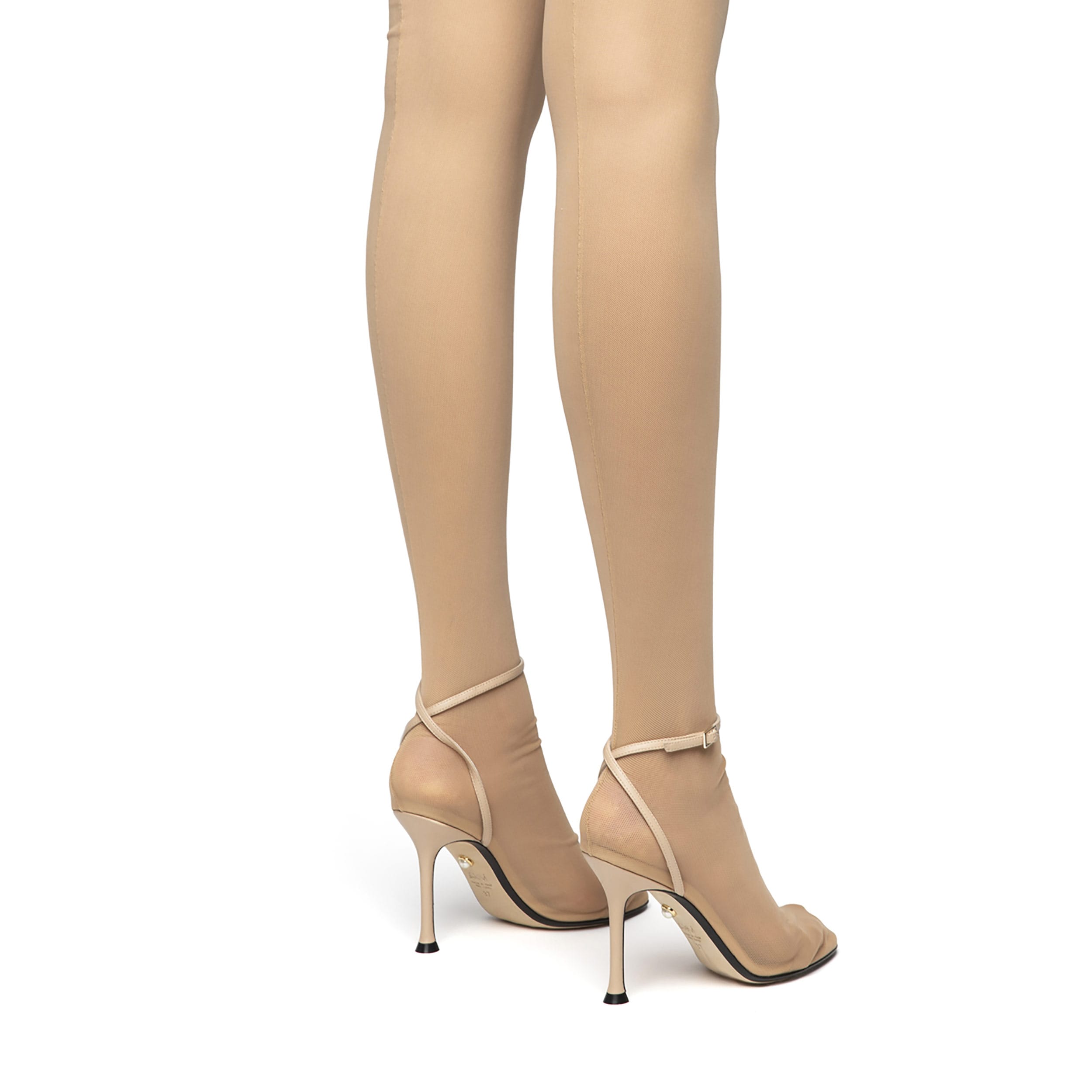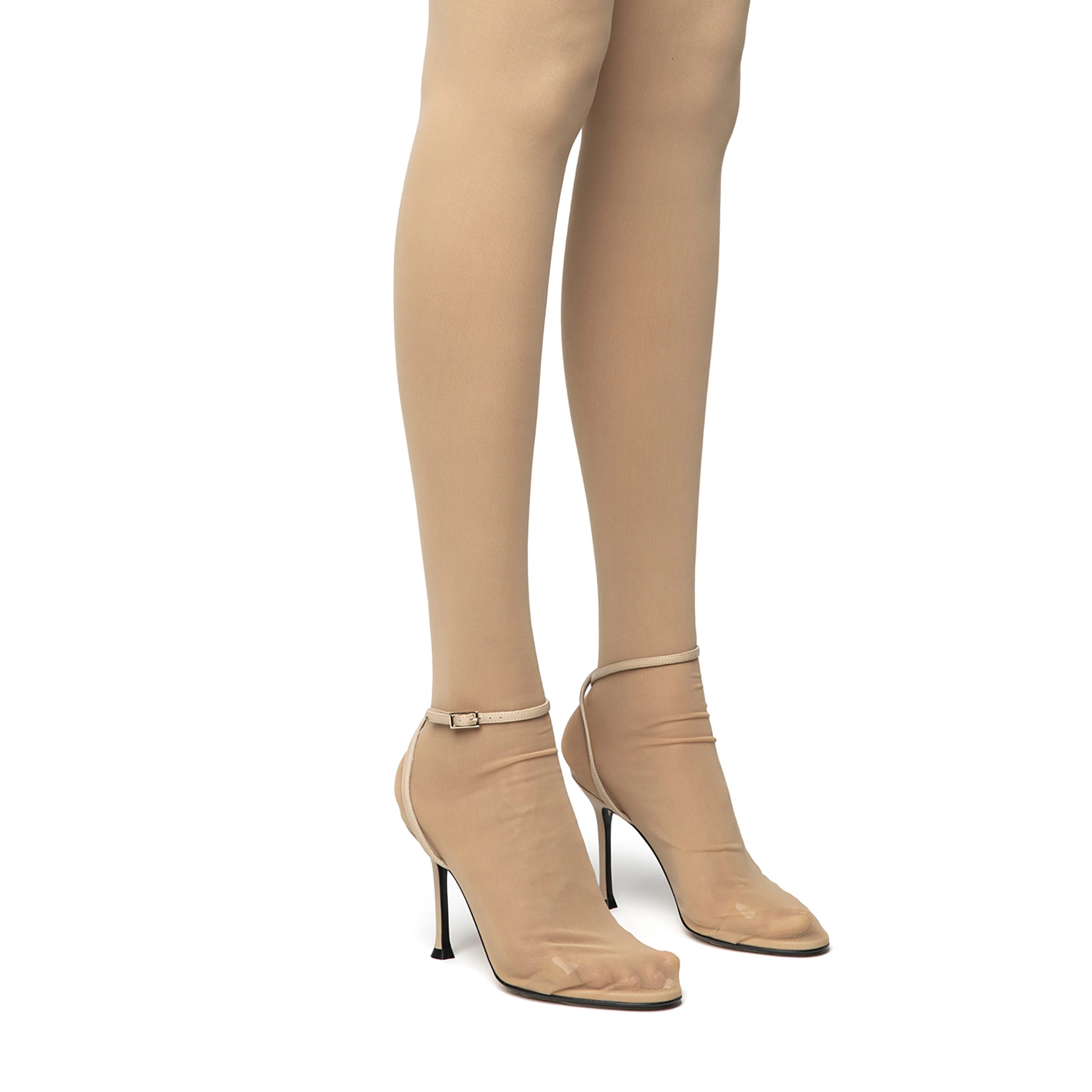 Stivale calza in tessuto semitrasparente con cinturino alla caviglia e tacco stiletto ricoperto.