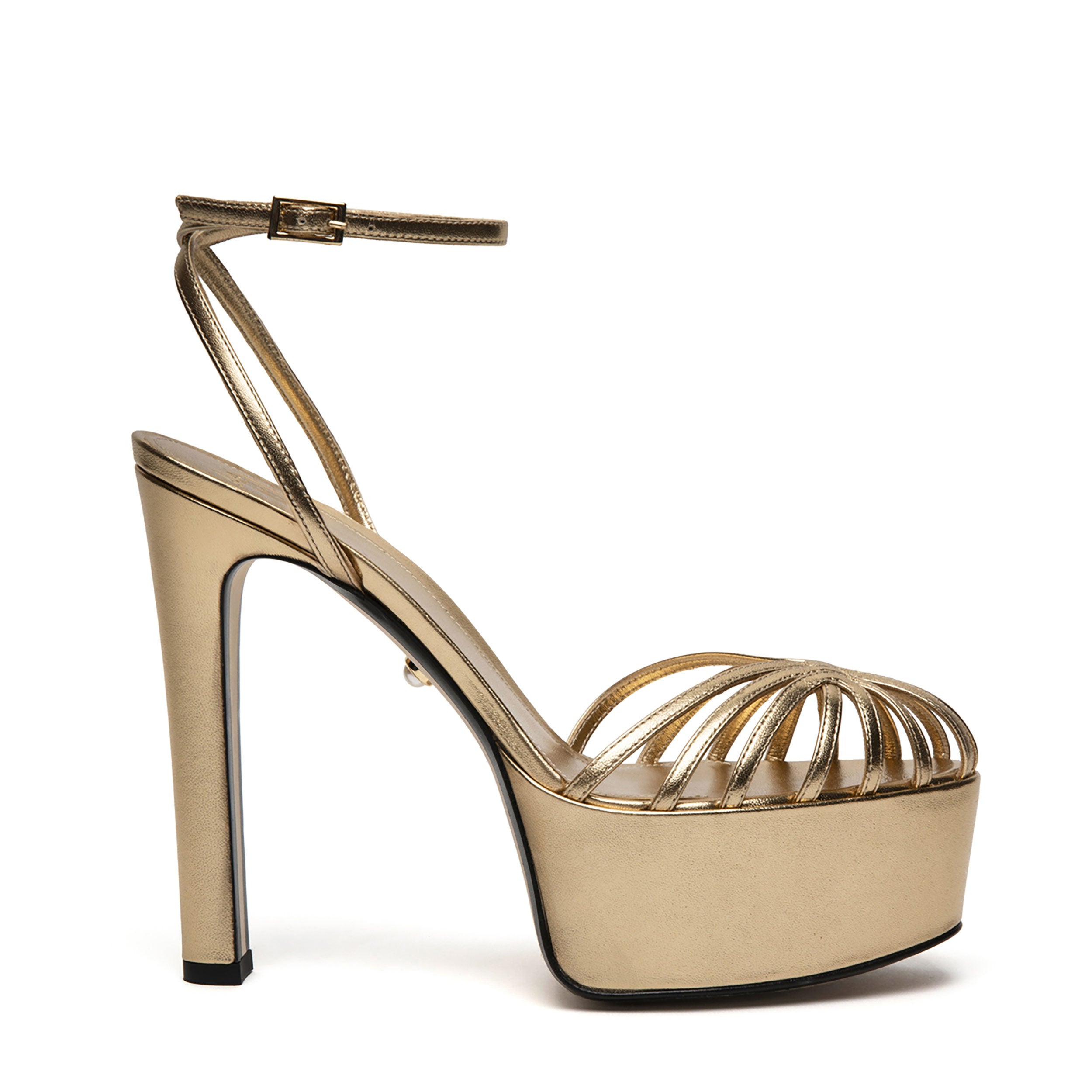 Sandalo gabbia con plateau in pelle laminata.