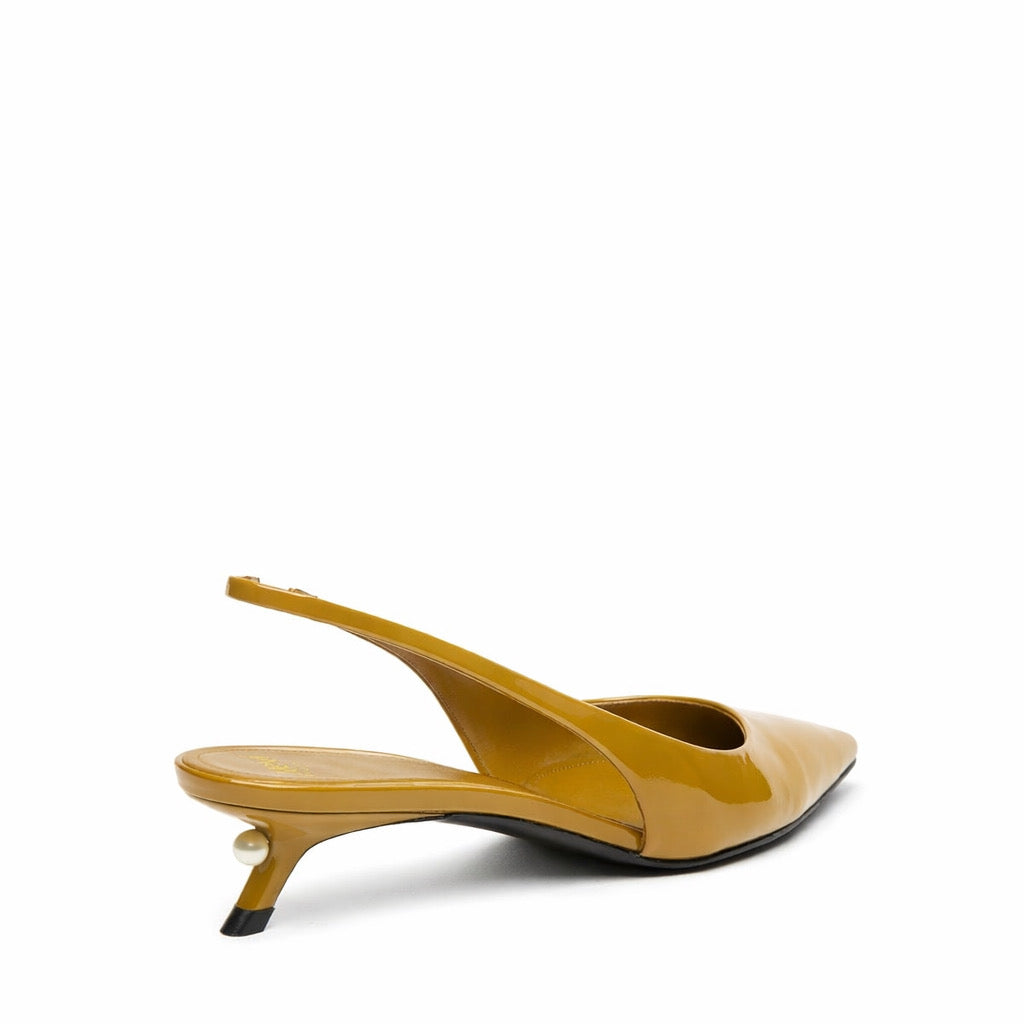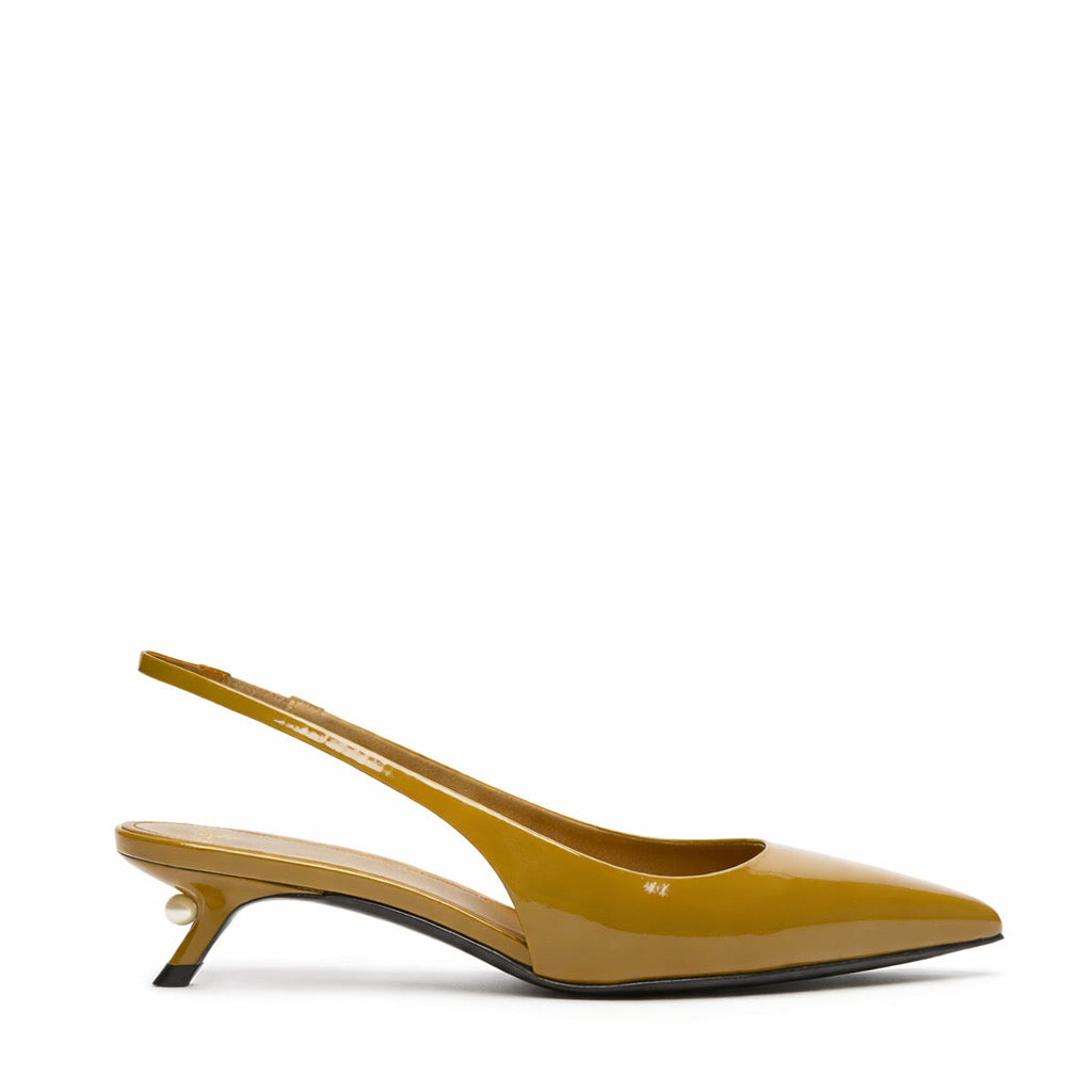 Slingback in vernice con tacco basso e perla applicata su tacco