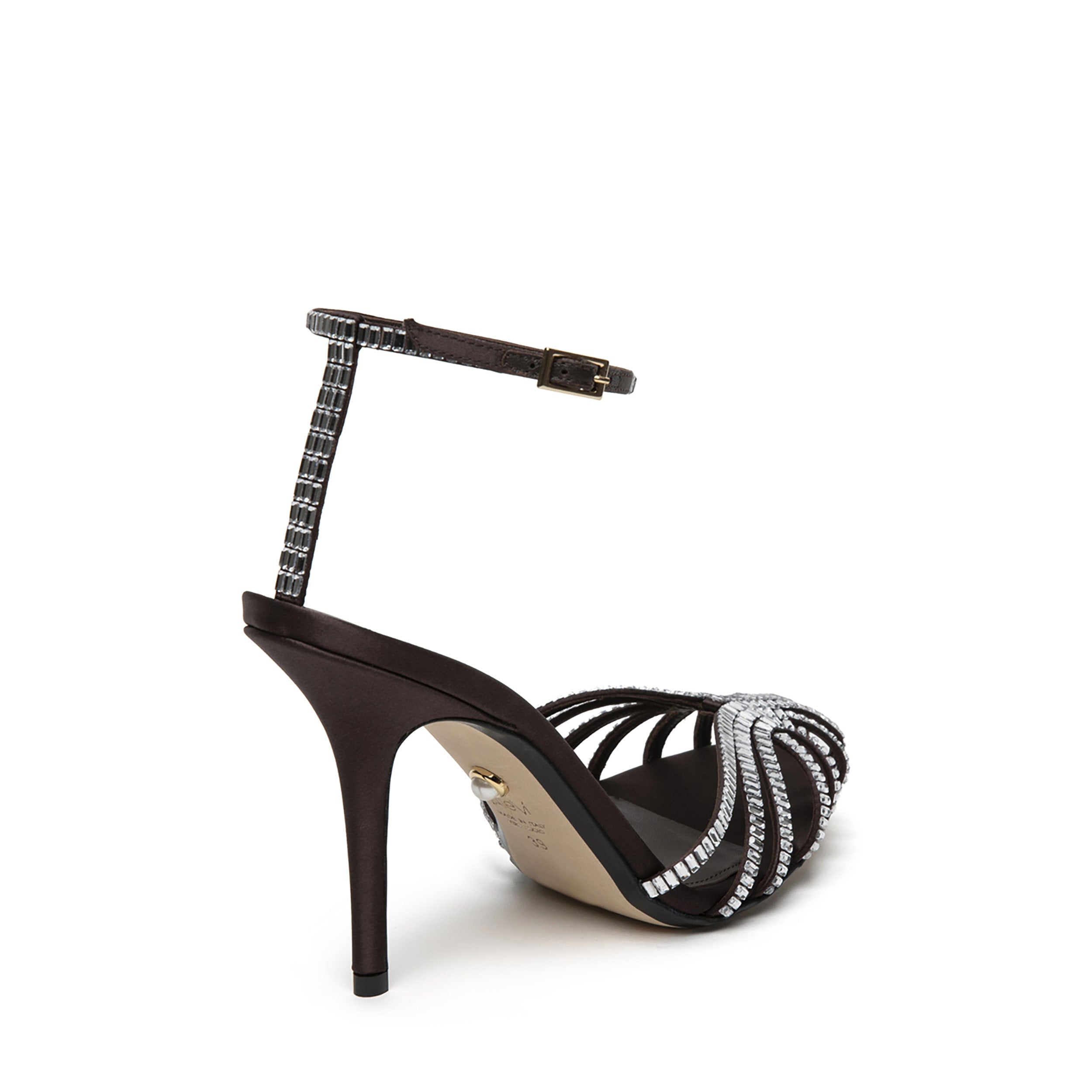 Sandalo in raso completamente ricoperto di baguette crystals.