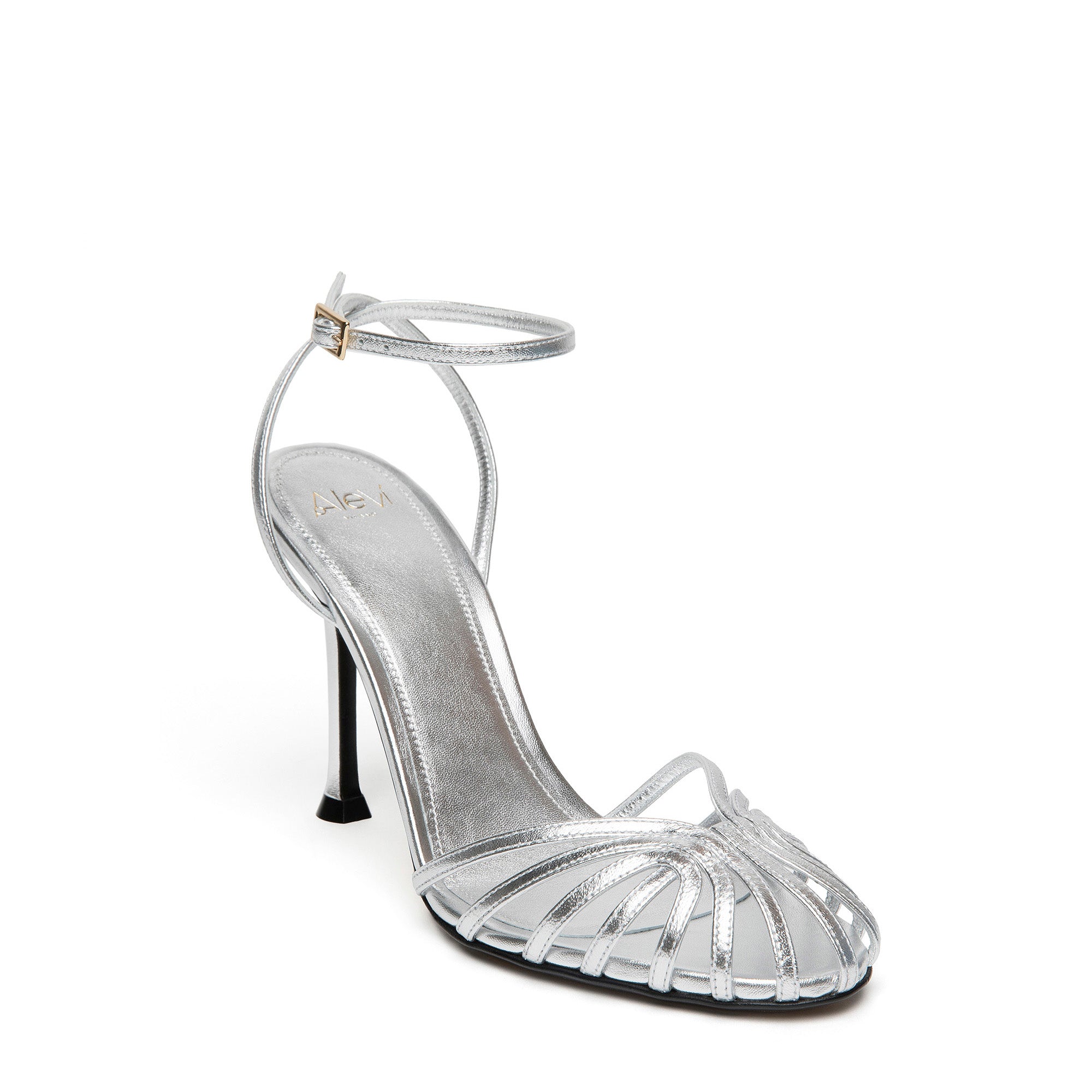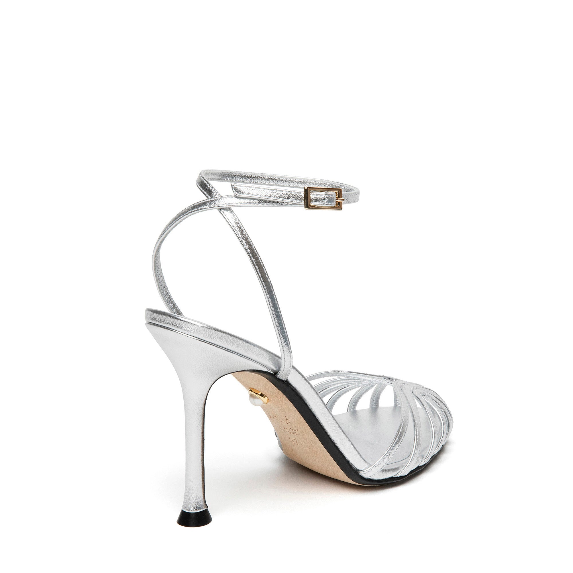 Sandalo gabbia in pelle laminata con tacco ricoperto in tono. Caratterizzato da listini sottili in punta e cinturino incrociato alla caviglia con piccola fibbia laterale.